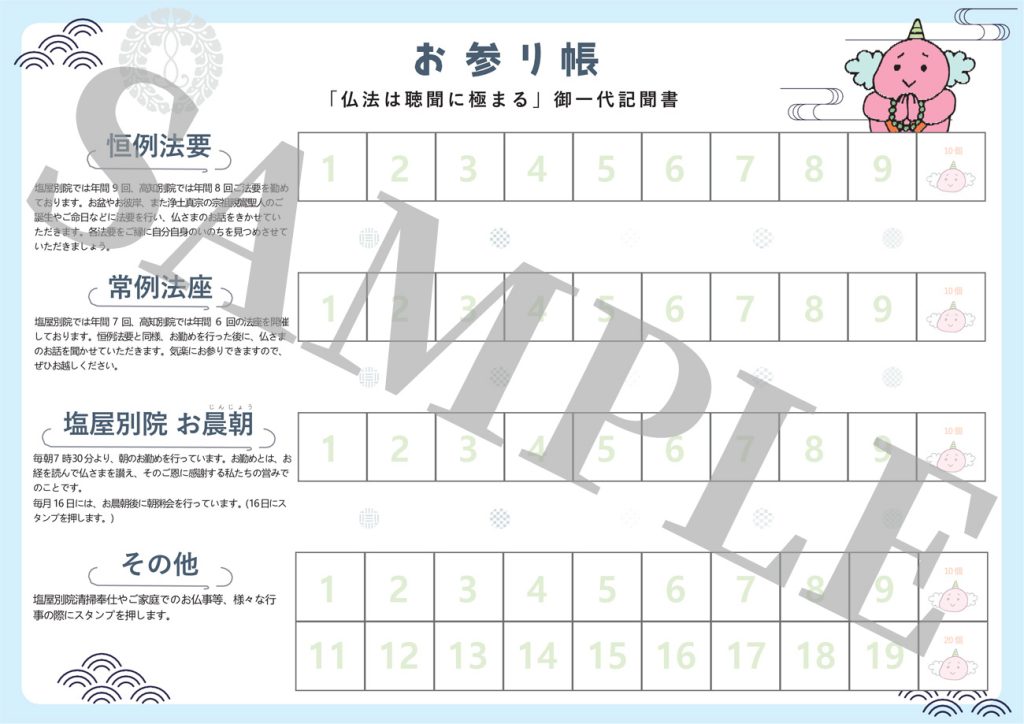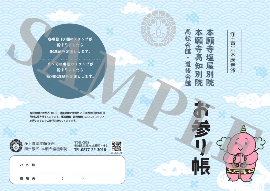 この度、一人でも多くの方に本願寺塩屋別院・本願寺高知別院・高松会館・道後会館に参拝し、お聴聞のご縁に遇っていただきたいとの願いから、参拝へのきっかけ、お参りの1つの楽しみとしていただけるよう、お参り帳を作成いたしました。
